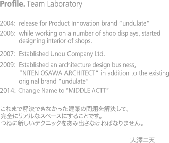 2009: Established an architecture design business, “NITEN OSAWA ARCHITECT” in addition to the existing original brand “undulate”